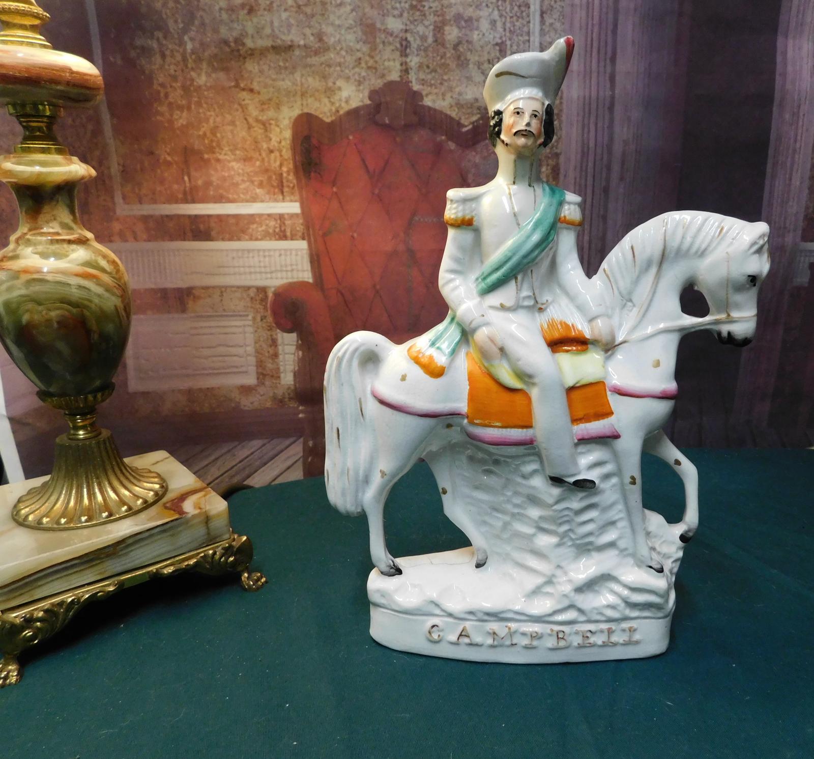 Offered for sale is a predominately white flatback mantle figure of Field Marshal Sir Colin Campbell in full regalia astride his horse. The figure is decorated in a simple palette with light flecks of gilding.